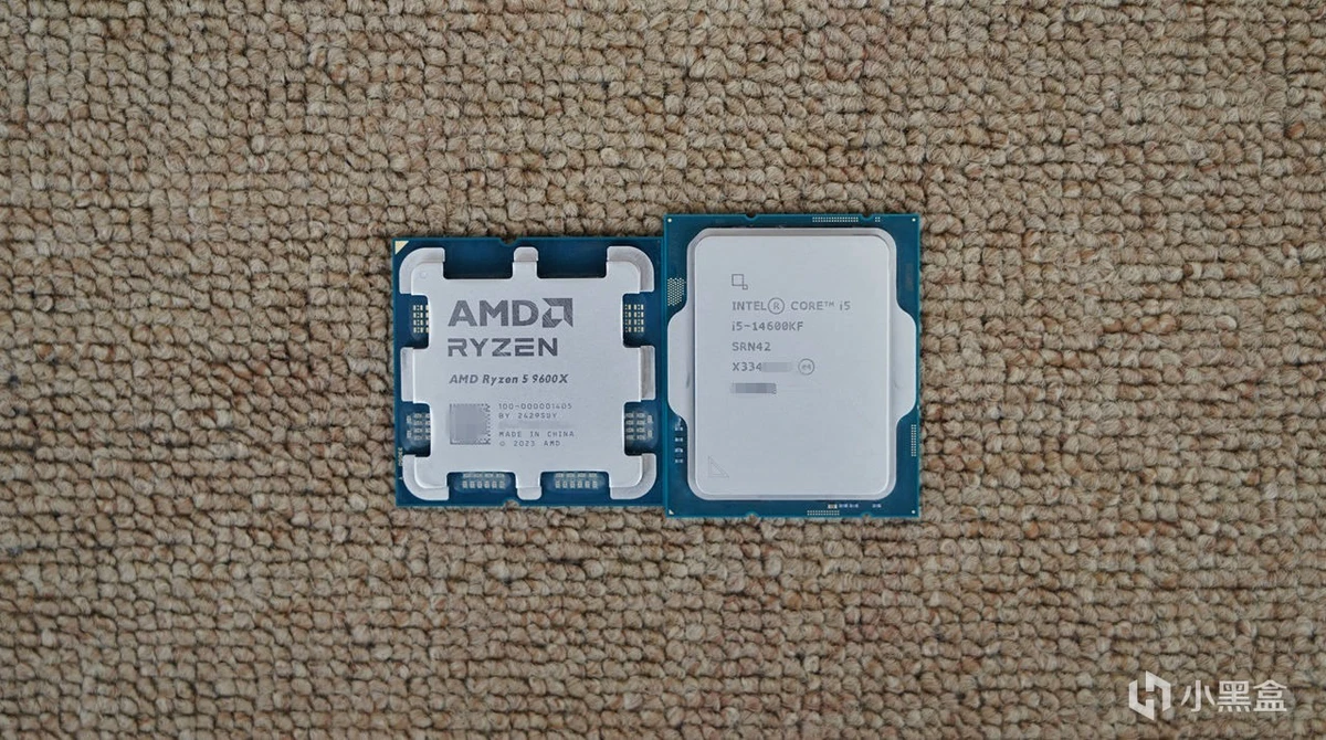 先看看两款CPU的外观,锐龙5 9600X采用了锐龙系列经典的八爪鱼顶盖式设计,i5 14600KF采用了长方形顶盖式设计,两者的外观区别还是蛮大的。