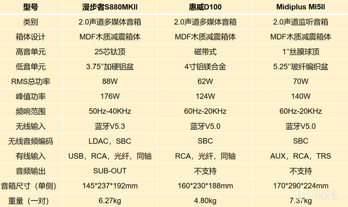 做工方面,漫步者S880MKII和Midiplus MI5II都做到了严丝合缝。尤其是漫步者S880MKII,在工艺如此复杂的情况下还能达到这么高的水准,真的值得点赞。而我入手的这一套惠威D100在机身侧面和背面出现了多处做工上的瑕疵,是值得品牌去反思和改进的。