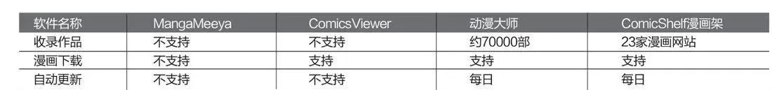 ManeaMeeva和ComicsVlewer作为本地漫画阅渎器,都只能加载本地漫画文件,并没有漫画作品的收录,不过ComicsViewer给出了网站下载链接,允许用户直接访问“动漫无限”网站进行下载。而另外两款阅读器中,《动漫大师》和《CornicShelf漫面架》可谓占尽上风,根据笔者的统计,《动漫大师》一共含超过70 000集漫画(如图3),《ComicShelf漫画架》虽然官方没有给出具体的收录数量统计,不过笔者发现该软件收录了KUKU动漫、99漫画、新动漫等国内23家动漫网站作品的在线同步更新(如图4),数量远远超过了《动漫大师》,完全可以用海量来形容了。两款软件都是每日更新,因此,可以做到将热门漫画一网打尽,在此轮较量中《ComicShelf漫画架》以压倒性的优势取得了胜利。