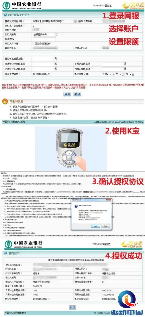 同时农行也给出了红色字体提示:您正在进行跨行授权支付签约操作,请确认收款人是您本人或您知晓的相关人,签约成功后您的签约账户的资金可以通过其他银行网上银行转出至收款账户,我行不再验证签约账户支付密码。请确保本次签约为您的真实意愿。
