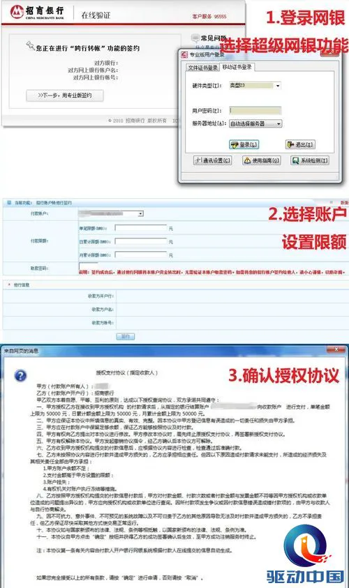 招商银行的超级网银名为“跨行转账”。当发起签约后,会弹出招商银行网银专业版登录对话框,需要用户插入U盾并输入移动证书的密码登录,登陆后同样会显示收款人的账户及姓名等信息,以及单笔转账限额、日累计限额和月累计限额。