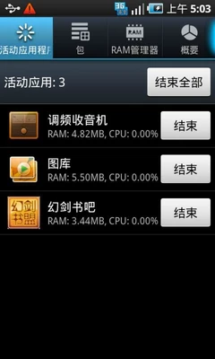 ▲后台运行程序一目了然,一键结束,开机RAM260MB左右,很不错。