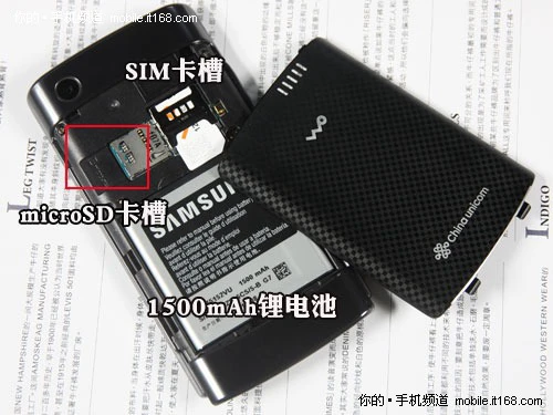 和电信版I909不同的是,三星Sphone联通版I9088的电池仓采用了类似于HTC Legend的设计,机身后盖底部可以向下来开一下段,进而取下金属后盖部分。