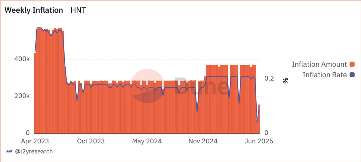 Helium 通过一种燃烧和铸造模型产生链上收入,该模型将真实世界的无线使用量直接与代币燃烧联系起来。用户将 HNT 转换为数据信用 (DC),这是在网络上传输数据所必需的。移动数据定价为每千兆字节 0.50 美元(5 万个 DC),而物联网的使用量则按每 24 字节的消息增量计费。这种结构确保在网络上传输的每个字节的数据都对应于链上活动。目前,该网络每周燃烧约 8.8 万个 HNT,这一数字呈强劲且持续的上升趋势。随着使用量的增长,越来越多的 HNT 将永久从流通中移除,从而直接将服务需求与代币稀缺性联系起来。
