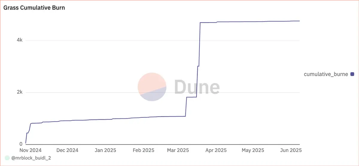 客户将 Grass 用作“住宅代理”网络。企业使用 Grass 测试本地化广告、比较区域价格、跟踪天气数据、训练 AI 模型等,所有这些都通过普通用户连接。LifeTIme Grass Burn Volume 仅略高于 5K 美元,这大大低于分配给供应侧的价值。