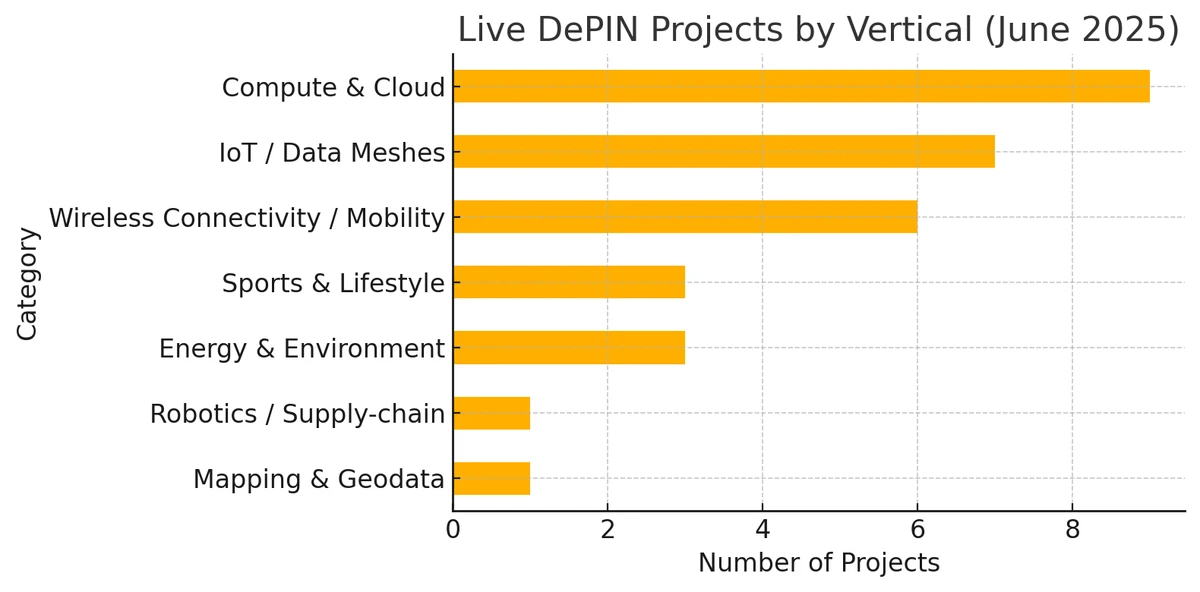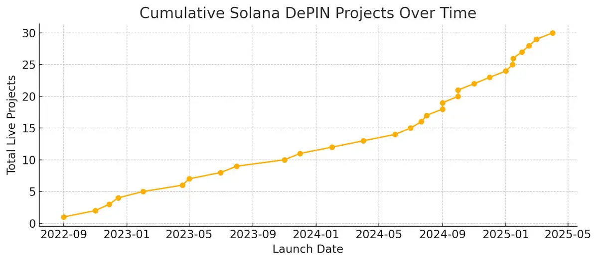 Solana 已经成为 DePIN 的主要LaunchPad之一,尤其是在优先考虑高频交易和深度 DeFi 集成的团队中:主网 DePIN 网络的数量已从 2023 年 5 月的 不到五个 攀升至今天的 三十个,跨越 七个垂直领域。因为每个证明、奖励和购买和销毁事件的成本仅为约 0.0005 美元,并在约 400 毫秒内完成,所以团队可以实时奖励贡献者(热点、GPU、传感器、行车记录仪),而无需批量处理或汇总。结果是新的部署稳步推进——在过去两年中,大约每三个星期就有一个新的网络。
