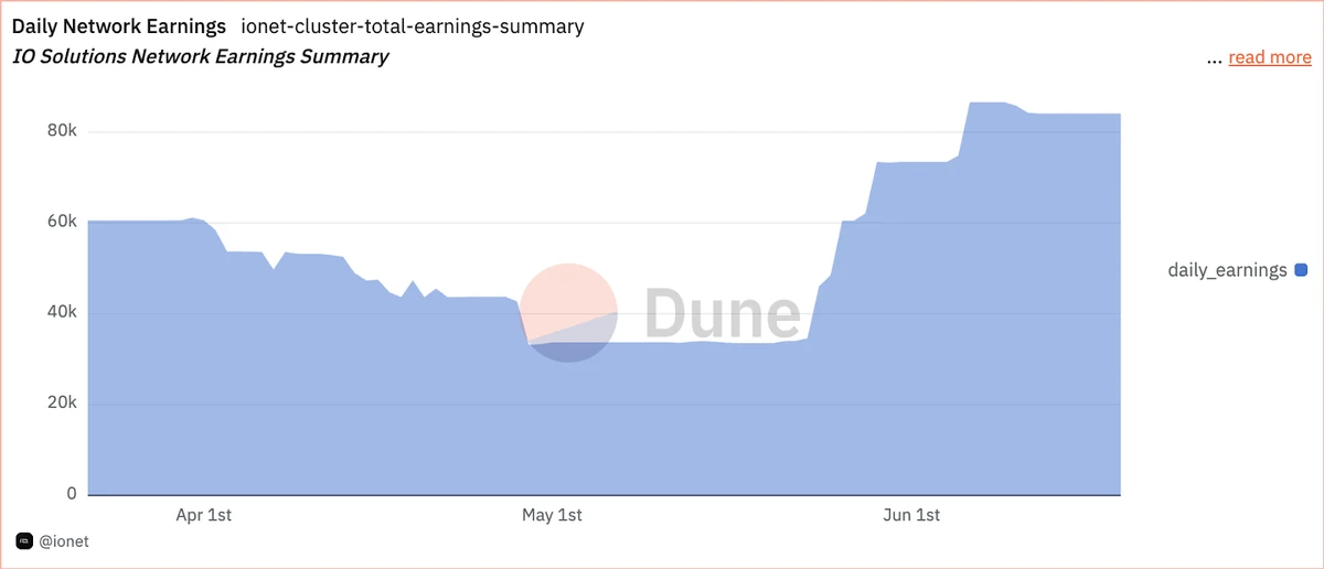 io.net - 承诺的计算量已扩展到约 450 PFLOPS 和 10K 个节点,每天处理约 8 万美元的 GPU 任务,高于主网启动时(2024 年 1 月)的 <1 万美元/天。