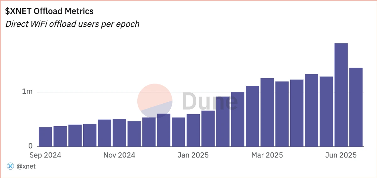 XNET - 在 2025 年 4 月的 AT&T 分流推出后,热点 mesh 现在为每个两周的 epoch 为 1800 万台设备路由 176 TB 的数据——比 2024 年初的流量增加四倍多。