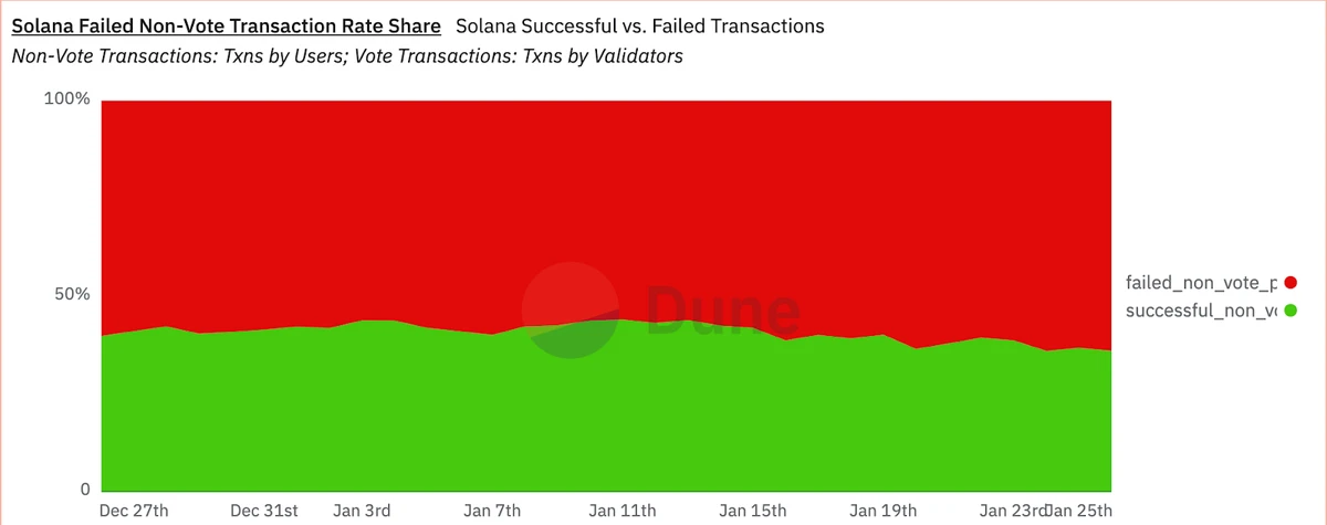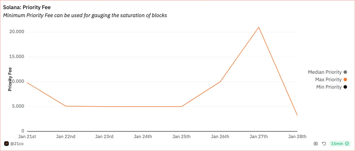 在 1 月 21 日,由于 mockJUP 空投,平均优先费用出现了激增,为即将到来的 JUP 空投做准备。虽然对区块空间的需求发生了显著变化,但实际用户在交易确认率和时间方面的变化相对较小。