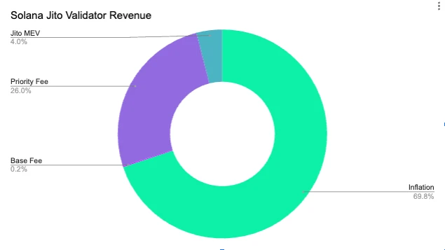 在 Solana 网络更广泛的金融领域中,用户贡献了高达约 1.89 亿美元的巨额费用,其中包括 166 万 SOL 的优先级费用和 14 万 SOL 的基本费用。这笔金额的一半(50%)专门用于销毁,从而减少 SOL 的总供应量。剩余的一半分配给验证者。此外,验证者还可以从 Jito MEV 奖励中受益,这为他们的年收入增加了约 848.4K SOL,约合 8900 万美元。MEV 和优先级费用的这些综合收入来源导致 Solana 验证者的年收入在 9230 万美元到 9740 万美元之间。此外,通货膨胀对验证者收入产生了重大影响,每年额外贡献 1.465 亿美元至 2.934 亿美元。确切金额因验证者设置的个人佣金率而异。
