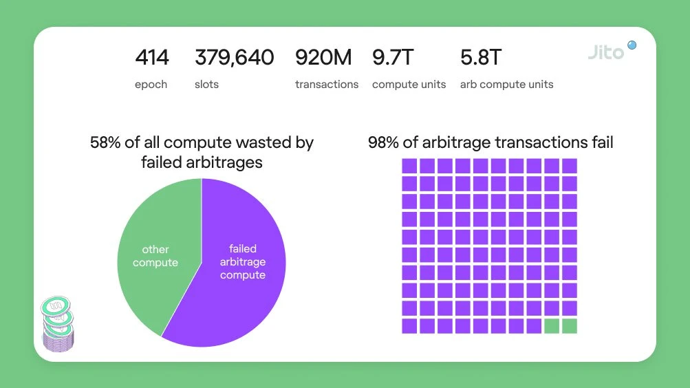Solana 当前的网络动态(其特点是基本费用固定且相对较低)加上交易优先级排序的非确定性,造成了一种无意中鼓励垃圾信息的局面,尤其是在套利机会的背景下。网络超过 50% 的计算能力被失败的套利交易消耗,其中只有约 2% 的尝试成功。这种低效率源于以下事实:在当前系统下,寻求从套利机会中获利的用户最好向网络发送垃圾信息。这种策略背后的理由是增加他们的交易在竞争中被执行的机会。基本费用低加上交易处理的不可预测性(包括交易调度中抖动的影响)加剧了此问题,导致大量交易拥塞网络而没有增加价值。