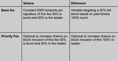在比较以太坊和 Solana 的费用结构时,有三个主要区别很明显。首先,Solana 具有固定的基本费用,而以太坊的基本费用会根据上一个区块的利用率从一个区块调整到另一个区块,目的是使区块保持大约 50% 的容量。其次,对于 Solana 上的基本费用和优先级费用,50% 的费用会被销毁,其余的费用会分配给区块生产者(领导者)。相比之下,在以太坊上,所有基本费用都会被销毁,优先级费用会奖励给区块生产者。第三,交易成本的计算方式存在根本差异:在以太坊上,成本会随着交易使用的计算资源量而增加,而在 Solana 上,交易成本不会随着计算使用量而变化。