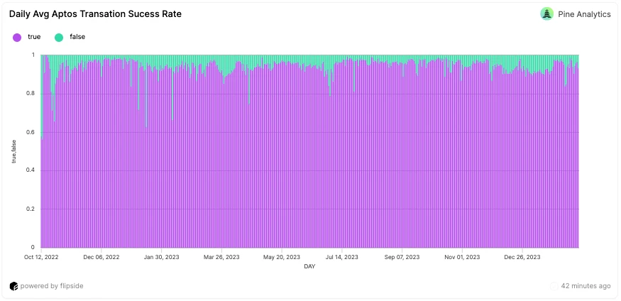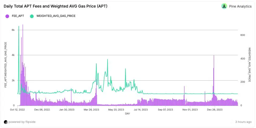 对 Aptos 网络的分析显示,交易成功率一直很高,通常高于 90%。虽然罕见,但也出现过几次低于 70% 的情况。尽管存在这些波动,但网络通常保持良好的正常运行时间。此外,数据表明,在大多数日子里,交易 gas 价格都接近基本费用。但是,有一个显着的时期(大约三个月),gas 价格飙升至基本费用的约四倍。