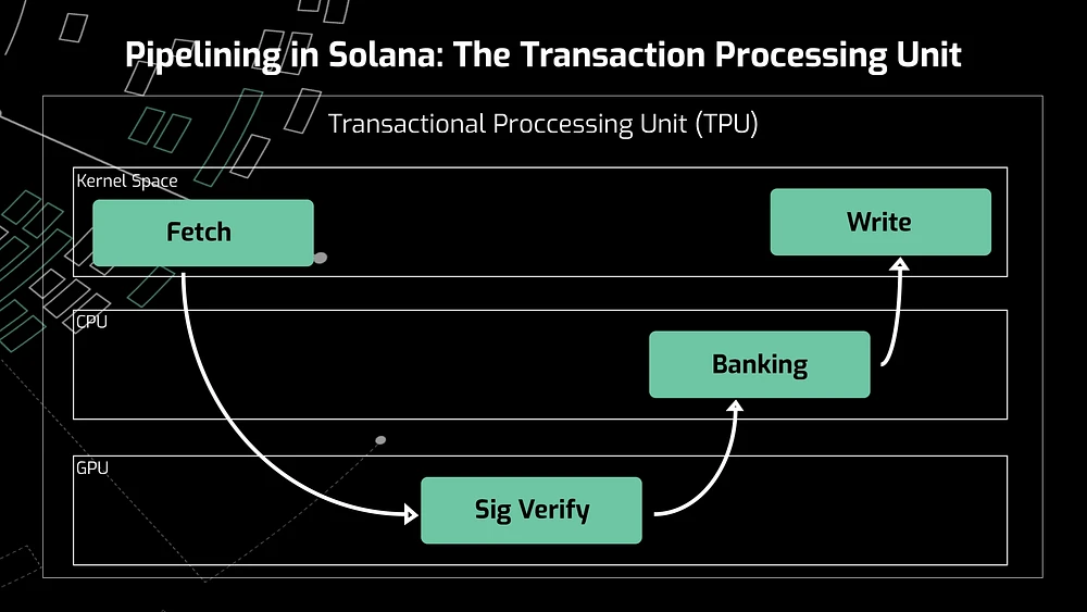 在 Solana 网络中,流水线机制 — 交易处理单元(TPU) — 通过 数据获取(Data Fetching,内核级别)、签名验证(Signature Verification,GPU 级别)、银行业务(Banking,CPU 级别)和 写入(Writing,内核空间)逐步推进。当 TPU 开始向验证者发送区块时,它已经获取了下一组数据包,验证了它们的签名,并开始入账代币。