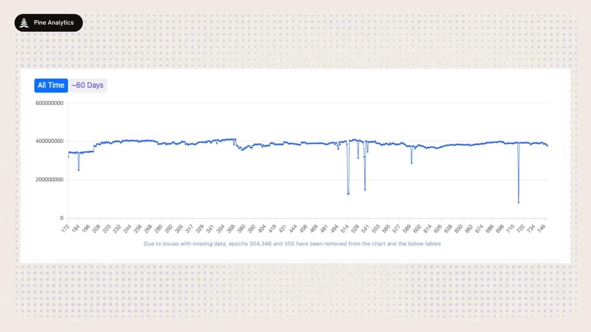 历史数据显示,自 epoch 180 以来,质押的 SOL 总量仅波动了 ~10%。