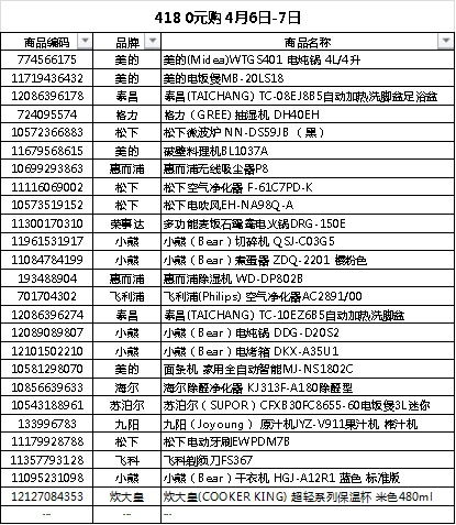 苏宁易购“0元购”是每月针对小家电产品为消费者提供的福利活动。此次418大促期间,“0元购”在4月6日开启,持续两天狂欢。涉及美的、九阳、苏泊尔、小熊、松下、飞科等品牌,爆款电饭煲、微波炉、豆浆机等厨房电器,空气净化器、吸尘器、挂烫机、电动牙刷、剃须刀等清洁个护产品,涉及到家庭方方面面的小家电产品近千种。