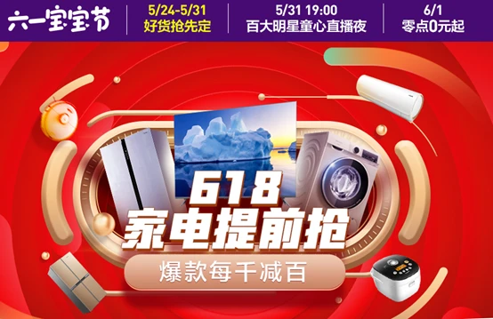 预售会场显示,提前预付定金可享受立减、加送、30天价保等优惠。5月27日-31日提前将心仪的家电商品加购到购物车,6月1日零点正式付尾款,多款产品享0-1点限时优惠,还可抢618元大额家电补贴券。