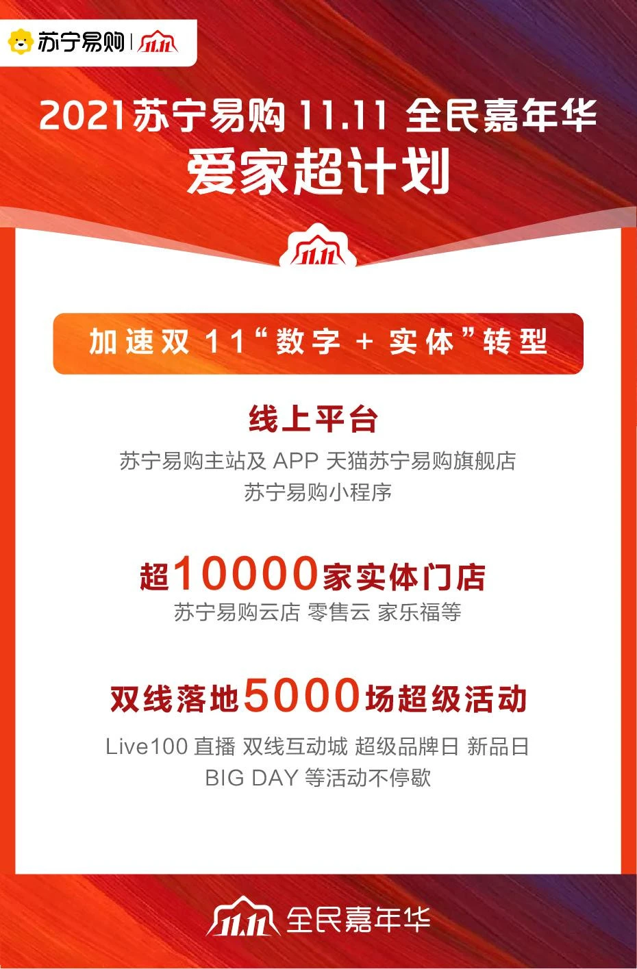 今年的双十一,苏宁易购将依托线上平台、线下超1万家实体店,双线落地“LIVE100直播”、“互动城”、超级品牌日、新品日、BIG DAY等5000场“超级活动”,推动双十一“数字+实体”转型蜕变。