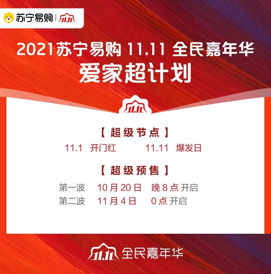 10月15日,苏宁易购发布“11.11爱家超计划”,全面启动2021双十一全民嘉年华。在消费升级、线下线上融合的大趋势下,苏宁易购将集中全部资源打造双十一购物季“爱家消费”主阵地,以自身优势打造三大关键词:聚焦家电家装消费、发挥双线融合优势、升级品质服务。