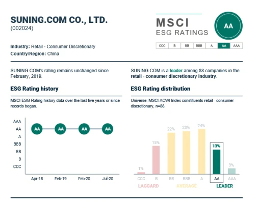 而在MSCI(美国指数编制公司)2020年7月更新的对苏宁ESG(环境、社会、公司治理)各方面表现的评估中,苏宁整体处于AA级,优于85%被评估的全球同业公司。