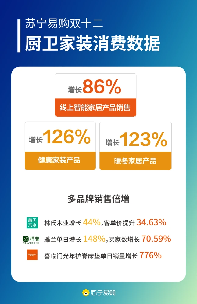 12月15日,苏宁易购发布的双十二厨卫家装消费数据显示,年末家电旺销带动家装热卖,线上智能家居产品销售同比增长86%,健康家装产品增长126%,暖冬家居产品增长123%。林氏木业、雅兰、雷士等头部家装品牌增长迅速,涨幅分别达44%、148%、60%;全屋定制“送装一体”订单量破新高,同比增长超60%。