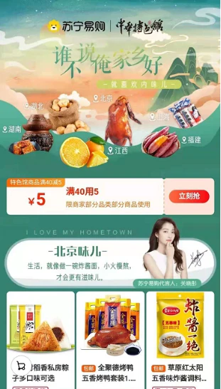 4月27日,苏宁易购上线了“谁不说俺家乡好”活动。关晓彤、张艺兴、江疏影、袁弘、欧豪、彭昱畅各自代言家乡出战,推荐家乡特色美食。来自中华特色馆的200家特色美食馆,为消费者提供最纯正的家乡味道。用户只需在APP搜索“咽口水”即可跳转进入活动页面。