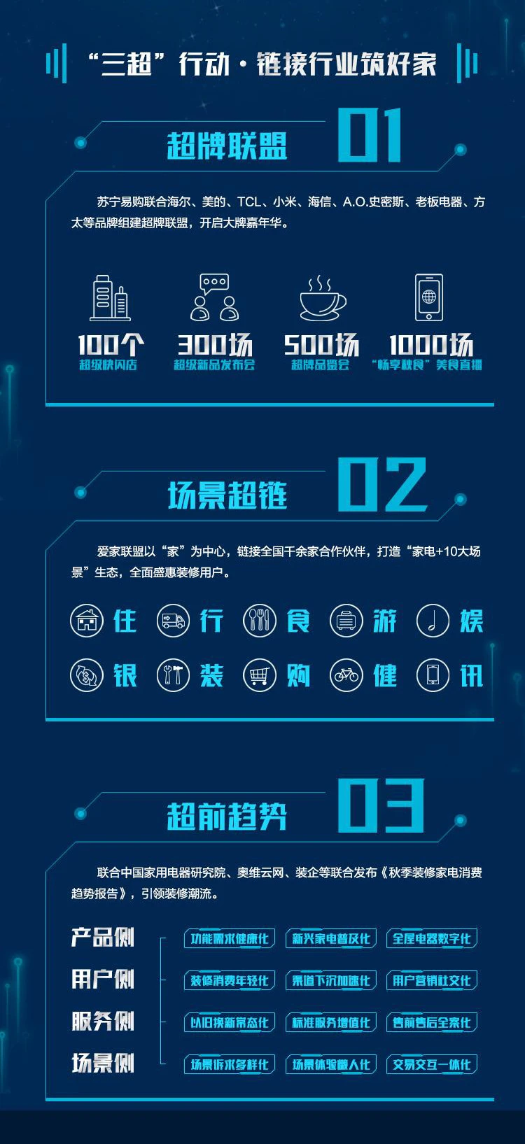 据了解,“三超”行动包括超牌联盟、场景超链及超前趋势。目前,苏宁易购已联合中国家用电器研究院、奥维云网等,从产品、用户、服务、场景四方面发布家电消费12大趋势。金秋家装节期间,苏宁易购还将推出“家电+10大场景”生态,链接住房、出行、旅游、娱乐、银行、装修等10大场景,普惠消费者。同时,苏宁易购充分发挥全国门店及平台优势,联合海信、A.O.史密斯、老板电器等品牌,打造100个超级快闪店、300场超级新品发布会、500场超牌品鉴会、1000场“畅享秋食”直播等活动,给装修用户更多惊喜和体验。