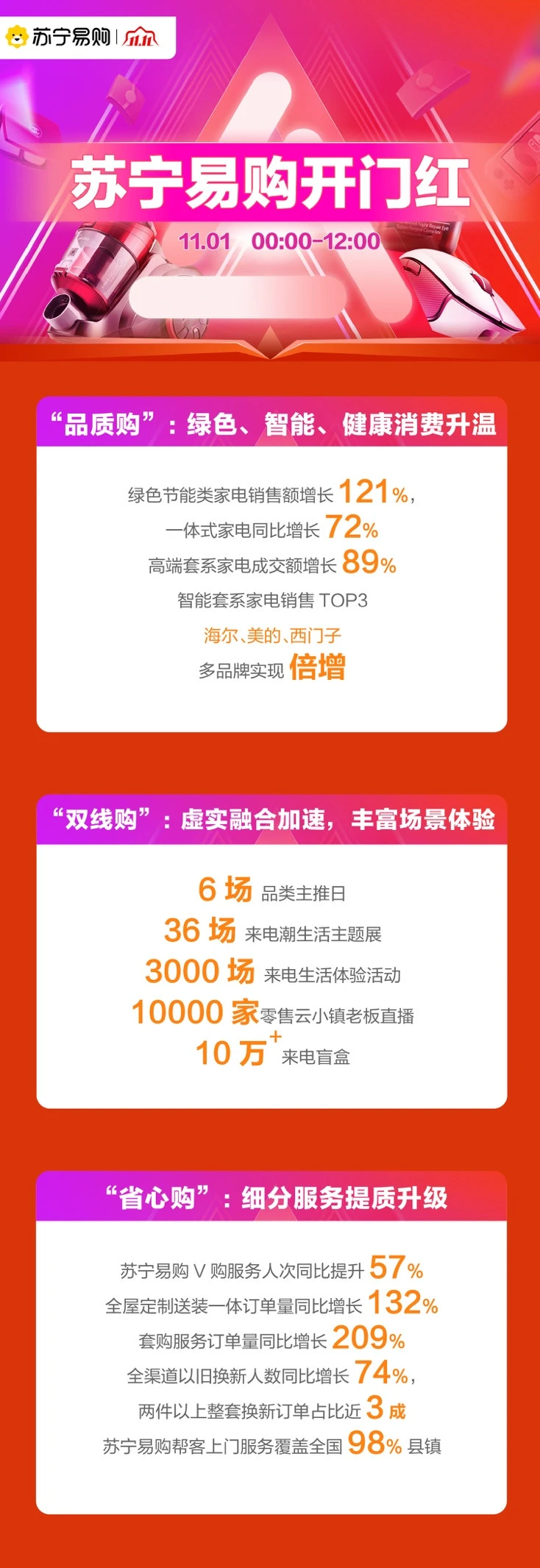 11月1日,苏宁易购双11进入爆发期,12小时高端套系家电成交额增长89%,绿色节能类家电销售额增长121%,一体式家电同比增长72%,消费热情持续释放,并呈现品质购、双线购、省心购三大趋势。