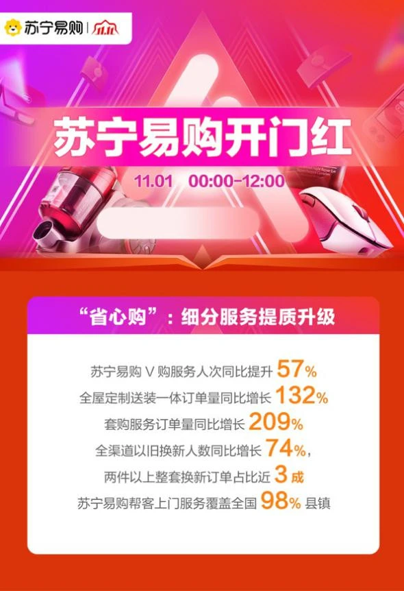双11进入爆发期,服务持续升级,“省心购”消费升温。据悉,双11启动以来,苏宁易购V购服务人次同比提升57%;苏宁易购物流全屋定制送装一体订单量同比增长132%,套购服务订单量同比增长209%;苏宁易购全渠道以旧换新人数同比增长74%,两件以上整套换新订单占比近3成。