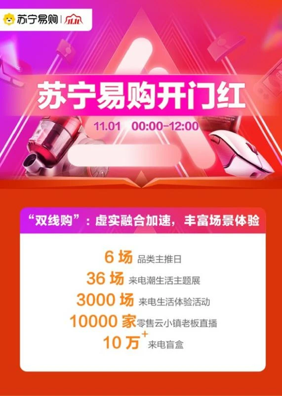 今年双11,从“电商大促”到双线融合趋势显著,苏宁易购依托线上平台、线下超1万家实体门店,双线落地“来电互动城”、潮店品牌日、新品日、“播动新生活”等5000场“超级活动”,引领“双线购”趋势。在线上,苏宁易购持续落地海尔、海信、realme、OPPO、iQOO等头部家电3C潮店品牌日,同时推出6场品类主推日,重点覆盖家电家装3C等品类。在线下,苏宁易购门店化身有温度、可互动的潮流集市,落地36个潮生活主题展、3000场潮生活体验、派发10万个“来电盲盒”,推动双十一从“卖产品”到提供场景体验和生活方式的转变。在县镇,苏宁易购10000家零售云门店将开展小镇老板双11直播,同步推出“超级省钱攻略”和“贵就赔”服务。