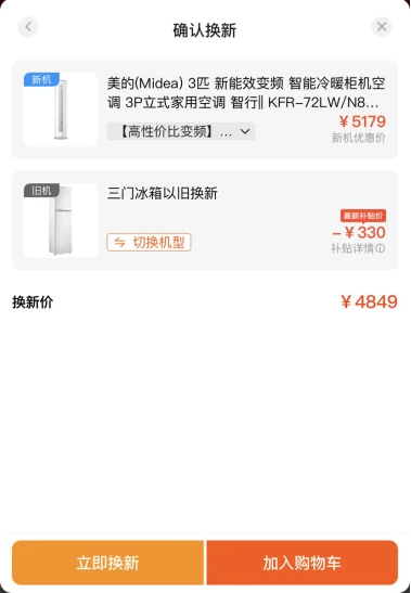 到这一步,回收流程已经深入融合到购新链路中,直接抵扣旧机款、换新补贴,只支付差价即可一步提交回收及购新订单。并且可以实现家电品类互换,空调也可以换洗衣机。