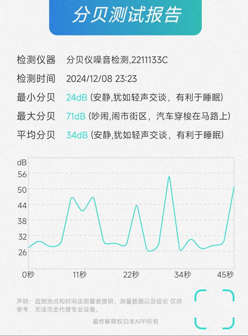- 降噪效果明显,在写这篇文章前,我在宿舍,街道,食堂及树林都进行了测试。开启降噪后,环境音(鸟声,汽车来往声,食堂嘈杂声,笔记本风声,大自然风声,低分贝视频播放声等非人声)都降到了一个几乎听不到的分贝(15db以下)。对人声的降噪效果则较弱,不过也可以从舍友的嚎叫(70db)降到30-40db左右。降幅50%左右(图二为非吵闹宿舍环境,舍友突然嚎叫一声的分贝检测软件检测图)。总体来说,自从戴上这个耳机后,我再也没有为舍友的嚎叫头疼过,降噪打开加上40%的音乐就基本上听不到室友讲话了,像是创造了一个独属于自己的空间,对耳朵也很友好。我的200元耳机则需要开到60%以上的音乐声才能隔绝舍友大部分声音。