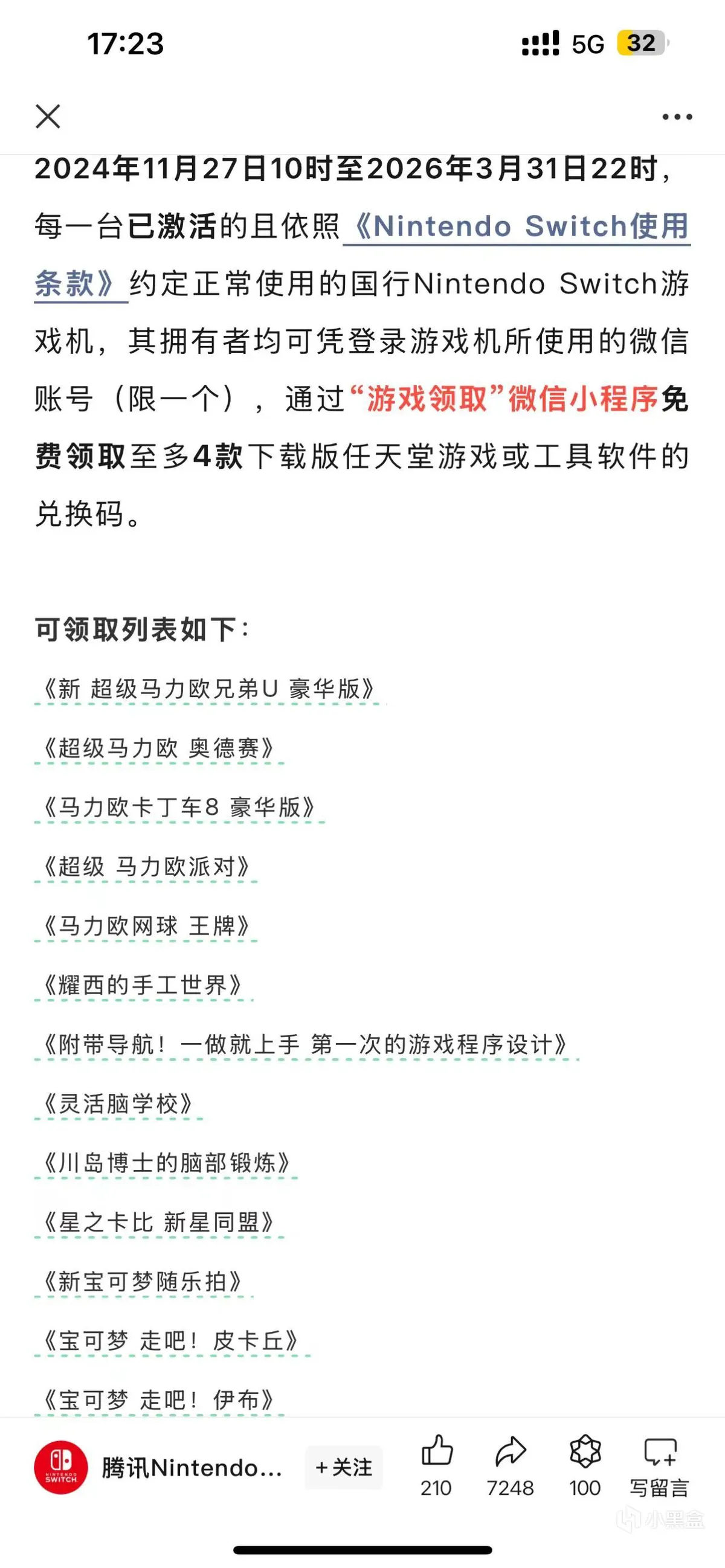 为回馈玩家,腾讯推出“回馈计划”。自 2024 年 11 月 27 日 10 时起至 2026 年 3 月 31 日 22 时,已激活且正常使用的国行 Switch 游戏机用户,可凭登录微信账号通过“游戏领取”小程序,免费领取至多 4 款任天堂游戏或工具软件兑换码,具体内容如下。