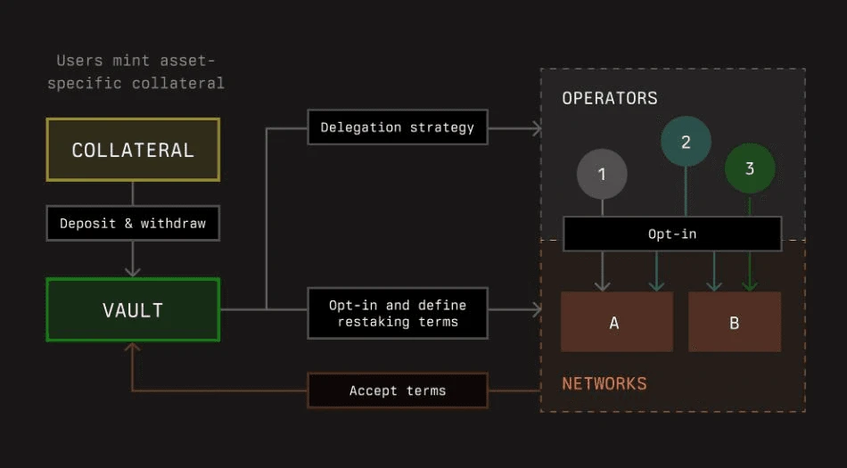 Vault 充当用户、网络和运营者之间的中间层。 用户将抵押品存入这些 vault 中,这些 vault 由 vault 部署者或所有者配置,以定义特定的委托和质押策略。 运营者选择加入网络和 vault,利用委托的抵押品进行验证。 这种抵押品支持网络运营,由此产生的质押奖励将分配回给存入抵押品的用户。