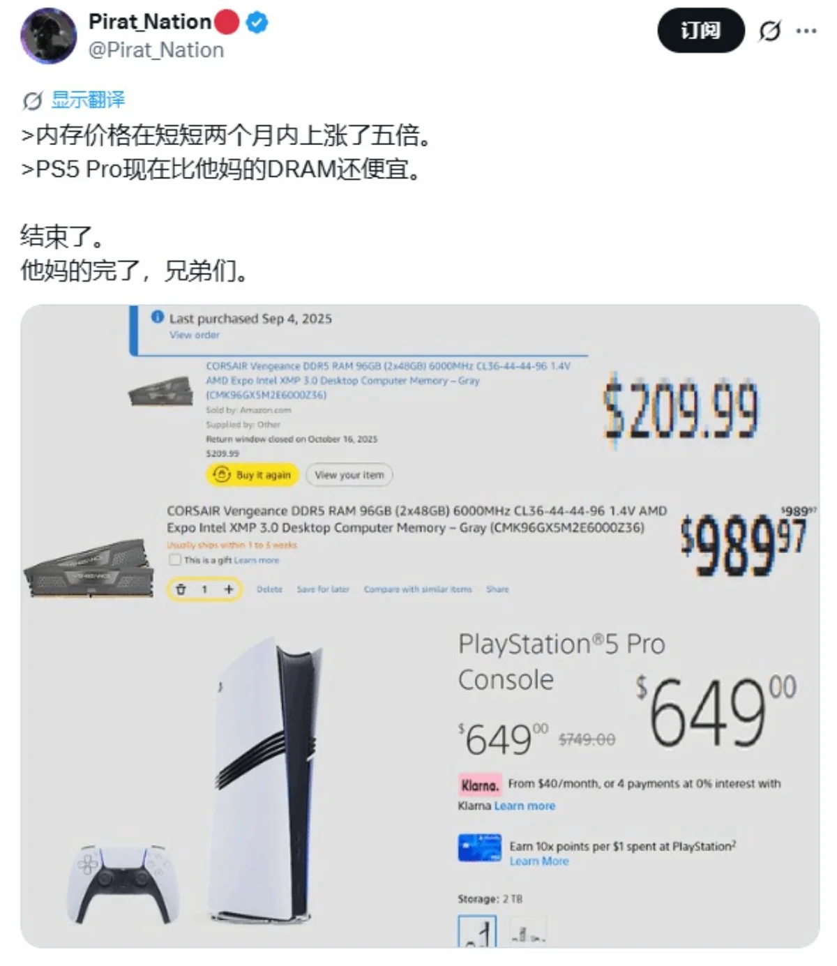 近期全球存储芯片价格持续暴涨,在欧美等地,64GB容量的高端内存条售价已飙升至约8500元人民币,这一价格甚至超过了索尼PS5 Pro游戏主机的整机售价。有网友在社交媒体上直言“现在组装游戏PC,内存已成为最昂贵的部分之一”。