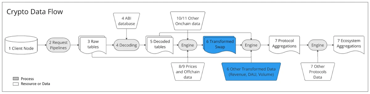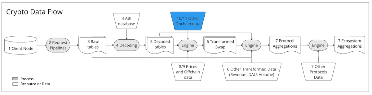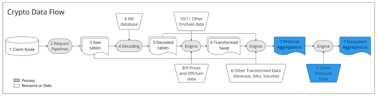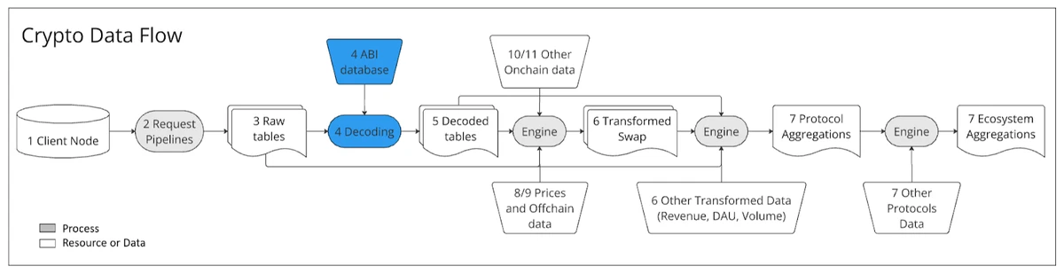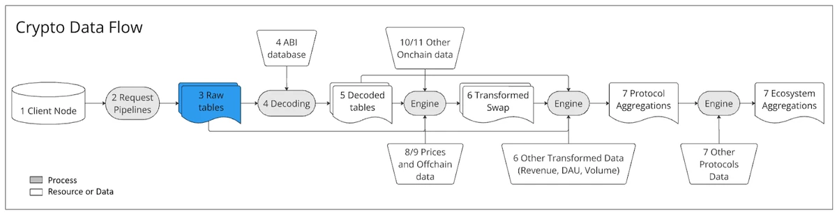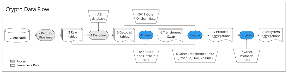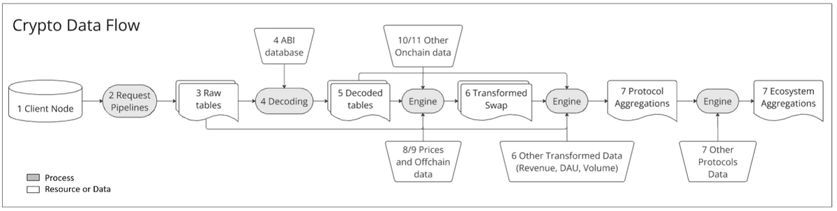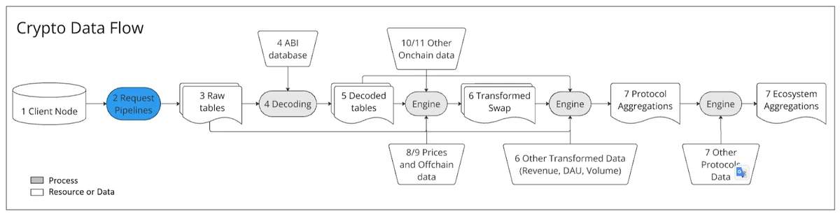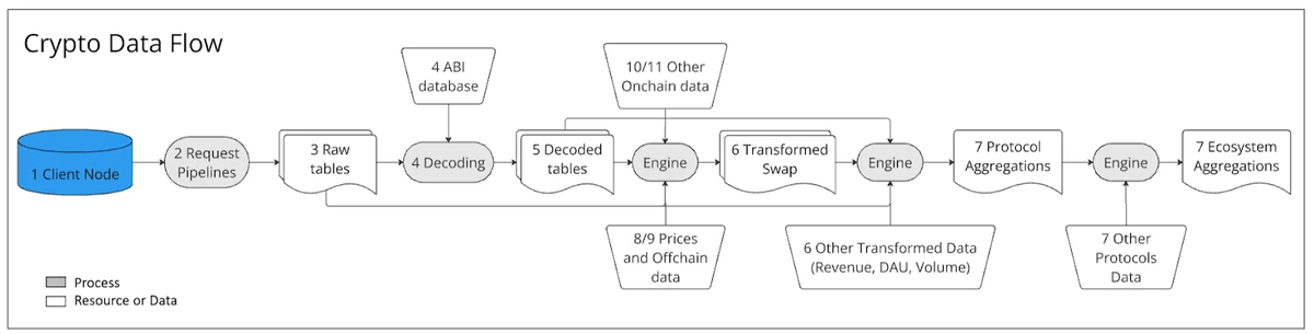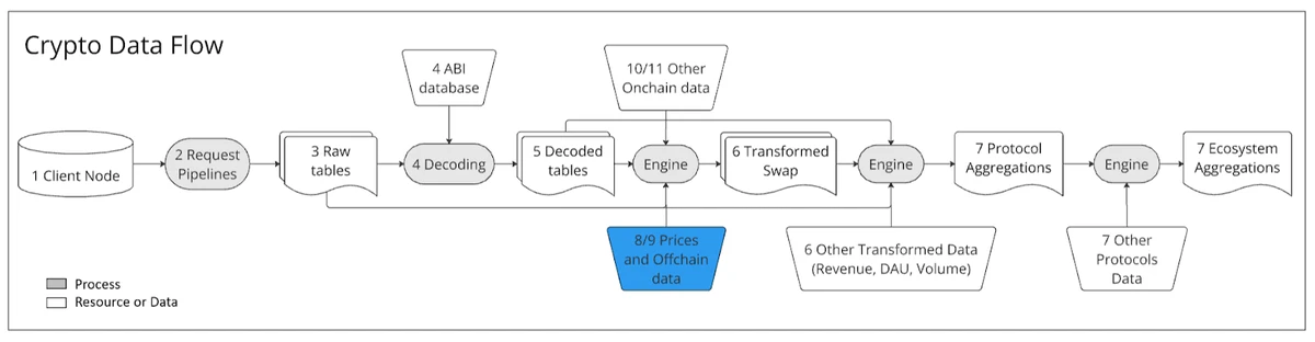 理解加密数据流对任何在区块链领域工作的人都至关重要。本文探讨了数据流动过程中的关键步骤——从获取原始链上数据到使用客户端节点、请求管道和转换引擎将其转变为可操作的指标。我们探讨了解码数据的重要性、处理视图函数调用以及整合链外信息(如价格),强调了每个过程中的复杂性和细致需求。