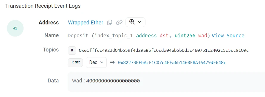 上述交易日志,翻译为可读事件。它是将 4.10^17 wad 存入 WETH 的存款,目标账户为 0x82273BFbAcF1C07c4EEa6b1460F8A36479dE648c。