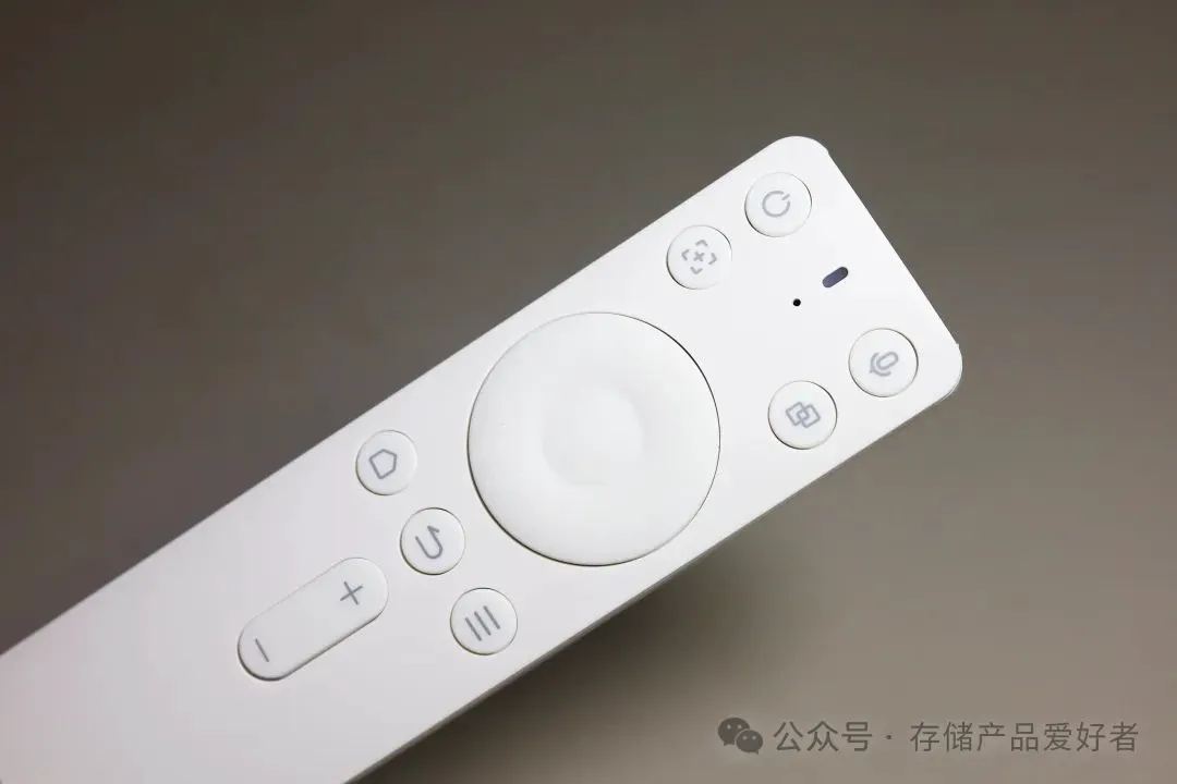 遥控器上的按键也很简单。从下往上依次是,音量加减键、home键(回到首页)、返回键、菜单键、方向键、开关键、自动对焦键、语音键(类似Siri、小爱同学的语音助手)、快捷键。这么简单,老人、小孩都能轻松使用。