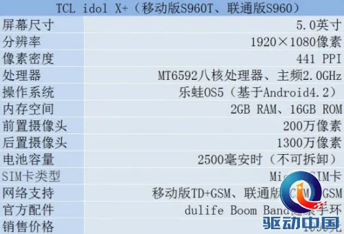TCL idol X+的基本配置信息:5.0英寸高清大屏幕、分辨率为1920×1080像素;联发科MT6592八核处理器、2.0GHz主频;2GB RAM+16GB ROM;前置200万、后置1300万像素摄像头;预装乐蛙OS5定制系统,基于Android4.2;电池2500毫安时,内置不可拆卸;在网络上拥有移动、联通双版本,移动版型号为S960T、支持TD-SCDMA+GSM,联通版型号为S960、支持WCDMA+GSM。PS:本次笔者收到的评测机型为移动版S960T,白色机身。