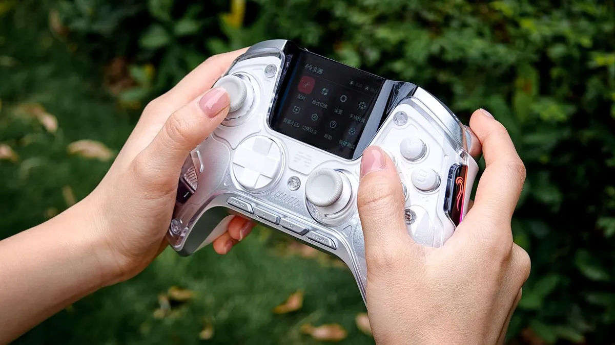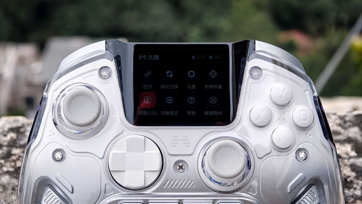 手柄正面有一块2英寸的超大智能屏幕,支持电量显示,模式切换,扳机,体感,按键编程等超过28项设置,在手柄上就能完成,而且是中文界面,简直不要太友好!