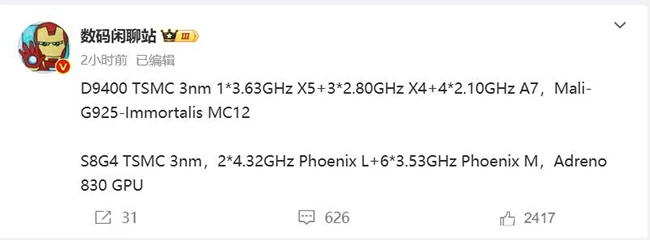 天玑9400基于台积电第二代3nm制程打造,这是安卓阵营第一颗3nm手机芯片,预计不出意外的话,将在vivo全新的旗舰机中首发,上市日期应该会在10月底。