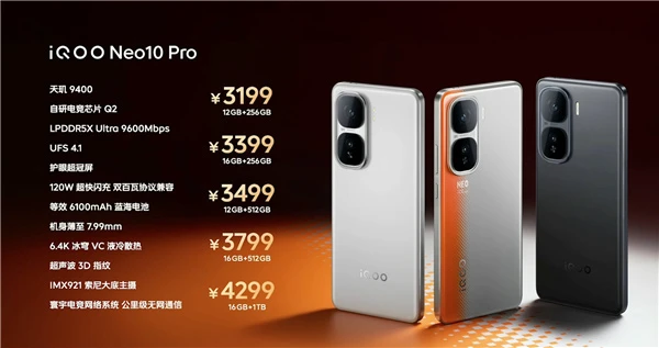 核心配置上,iQOO Neo10 Pro采用6.78英寸1.5K OLED柔性直屏,搭载天玑9400平台,前置1600万,后置5000万主摄、5000万超广角,电池是6100mAh,支持120W有线闪充。