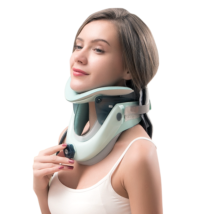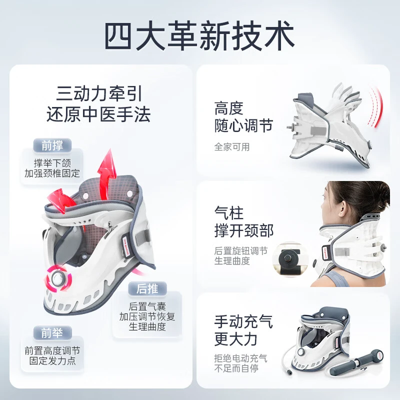 这款牵引器的结构紧凑,主要由PC、PP、皮革、TPU等材质制成,坚固耐用。它的双侧升级魔术贴设计不挑颈围,全家都可以使用。而且,它还配备了一个手持泵式打气筒,方便省力。