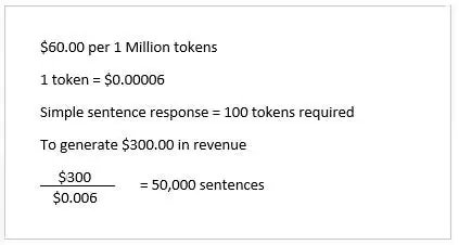 假设 OpenAI(ChatGPT 的运营商)使用通证来生成 ChatGPT 中对用户的回复。假设每个通证的价格为每 100 万个通证 60.00 美元,则每个通证的价值为 0.00006 美元。生成回复用户问题的句子所需的通证数量可能会因服务的要求和请求的复杂性而异。假设一个简单的回复需要 100 个通证,则每个句子的成本为 0.006 美元。因此,要以每句 0.006 美元的价格产生 300 美元的收入,需要创建 50,000 个句子。