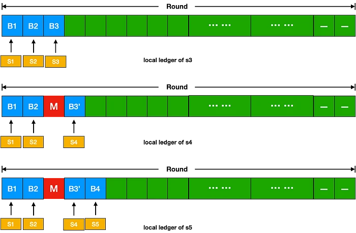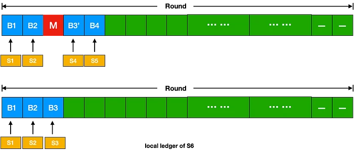 图 3 展示了在其中一个插槽内发生分叉的情况。S3、S4 和 S5 都在其账本中保留了由 S1 和 S2 生成的区块 B1 和 B2。然而,由于暂时的网络分区,S4 和 S5 没有接收到 S3 生成的区块 B3。当 S4 的插槽到来时,S4 认为 S3 可能已经失败,因此在 B2 的基础上生成了区块 B3'。随后,S5 依靠区块 B3' 生成区块 B4,因为它没有收到 B3。现在,在整个区块链系统中,存在两个不同的区块 B3 和 B3',在同一高度上(=3)。这种情况被称为暂时分叉。