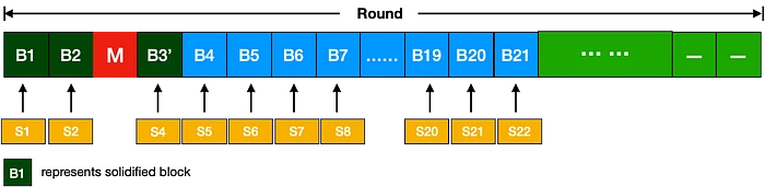 SRs 按照维护期内决定的顺序,在其对应的插槽中轮流生成新区块。图 2 示意了 SR 如何生成区块。