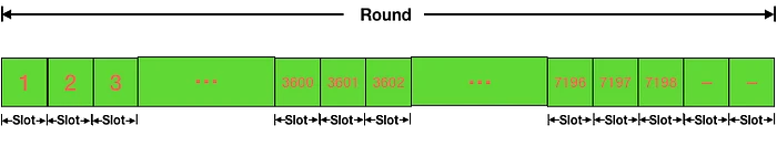 TRON 网络将每六小时定义为一个轮次,每三秒为一个插槽。因此,每个轮次包含 7200 个插槽。轮次和插槽之间的关系如图 1 所示。每轮的最后两个插槽是维护期,在这段时间内不会生成区块,并决定新的 SR 及其生成区块的顺序。