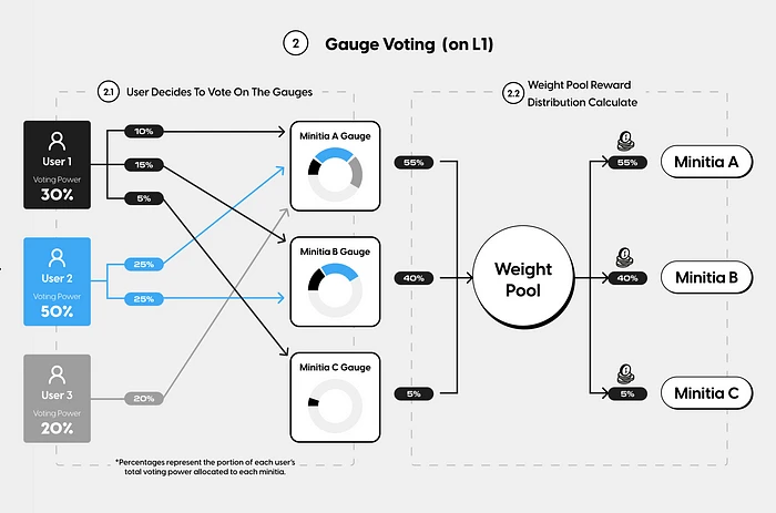 权重池:此奖励池根据其通过 L1 测量投票设置的权重分配给 Minitia —— 类似于 Curve、Convex 等。