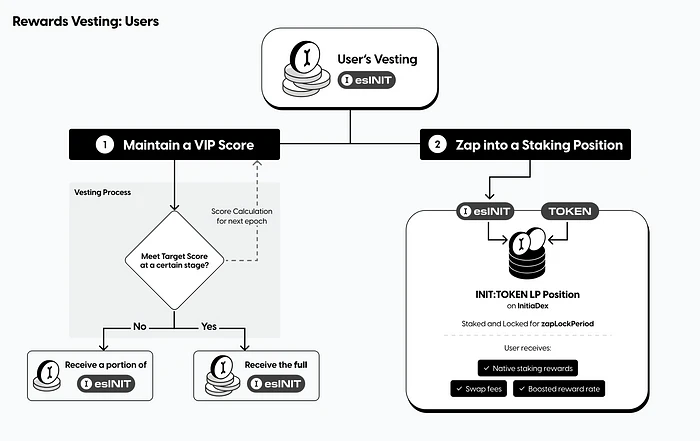 VIP 允许用户立即将他们的 esINIT 转换为 Initia L1 上的 26 个 epoch 锁定的质押 Enshrined Liquidity 位置。用户可以通过提供质押 LP 对的另一面来实现这一点。例如,用户可以通过提供创建该位置所需的 ETH,将他们的 esINIT 锁定到 Initia 的 L1 验证者的质押 INIT:ETH LP 仓位。