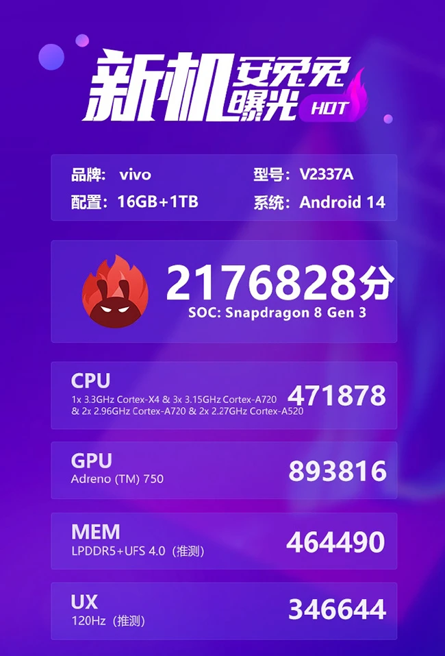 从跑分成绩来看,这款机型综合成绩为2176828分,其中CPU部分为471878分,GPU成绩893816分,MEM部分为464490分,UX成绩则是346644分,和目前的第三代骁龙8芯片的成绩相近。目前其他厂商的折叠屏一般都会在下半年才会上市,而vivo和他们的更新时间大概相差半年,所以可以更早地用上当年最新的旗舰芯片。